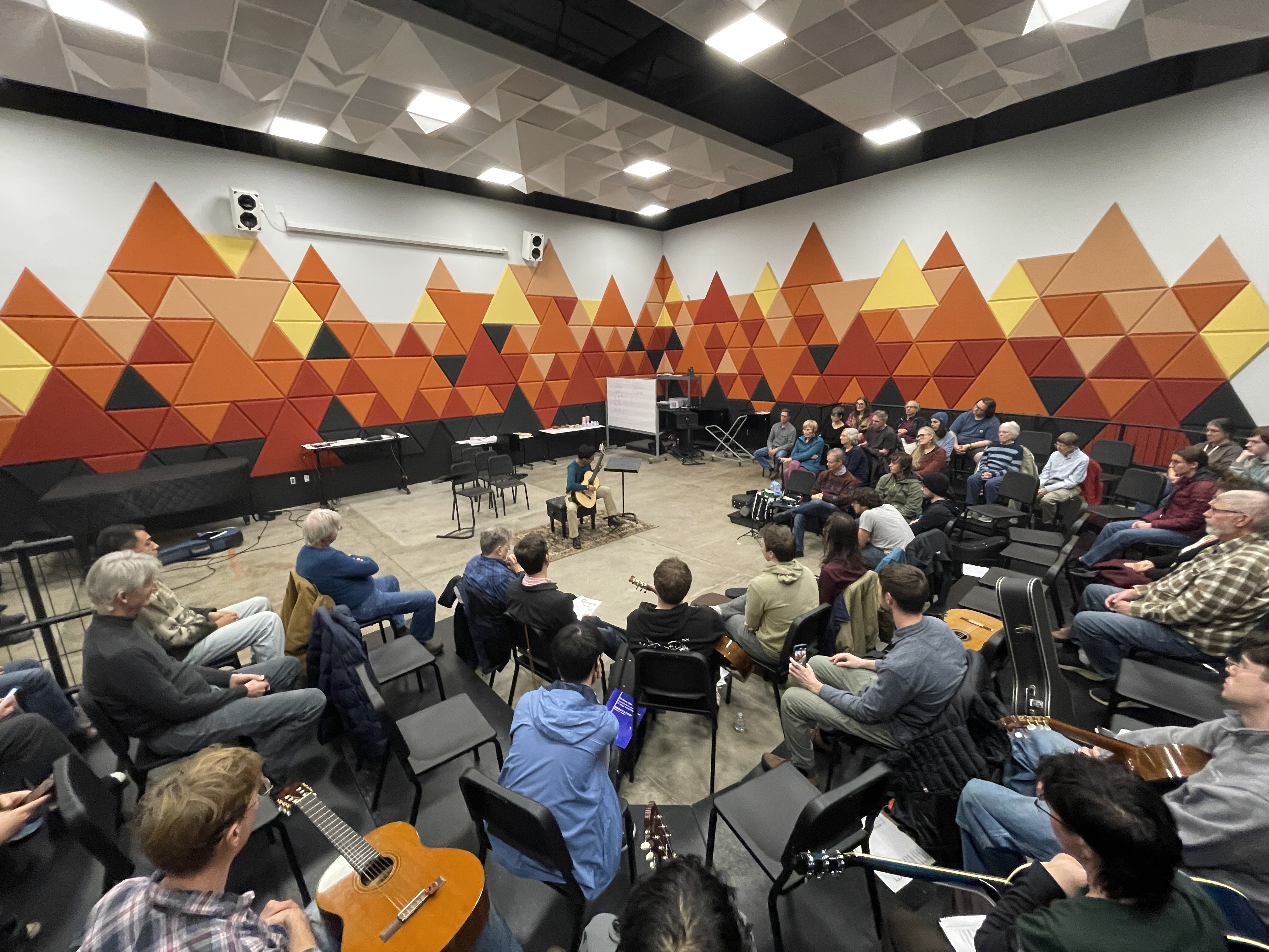 We hold Monthly Meetings that feature an open-mic stage for guitarists and small ensembles, along with a guest artist who performs an hour-long concert (more information below)